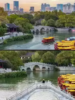In the early morning, a soft mist shrouds the river, reflecting the ancient bridges and the slow movement of boats. Strolling along the Qinhuai River, the cobblestone pavement is damp with light, red lanterns sway in the alleys, ancient gatehouses and shops bear the texture of time. Teahouses and snack shops have just opened, and the aromas and sounds of life intertwine. Time seems to stretch here, allowing one to savor the warmth and tranquility of Jiangnan. The afternoon light is at its brightest, with the red walls and white tiles reflecting off the sun in vibrant layers. The river shimmers, and boats and pedestrians mingle. The ancient streets and the city life are vividly interwoven in the light and shadow, imbued with the charm of the Qinhuai River.