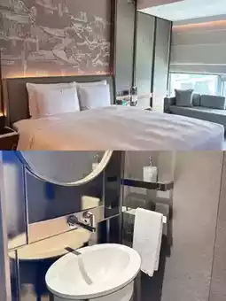 Highly recommend the "Purple Mountain View Executive Room"! Starting at 68㎡, the panoramic floor-to-ceiling windows frame Zhongshan Mausoleum and Purple Mountain’s frost scenery like an ink painting🌄 The bathroom is amazing—double sinks with Dyson three-piece set, and the round bathtub lets you soak while gazing at the starry ceiling✨ The bedding is 800-thread-count sea island cotton, soft as if wrapped in clouds☁️ The minibar is complimentary! Rain Flower Tea + Osmanthus Sugar Lotus Root, even the ice bucket is cloisonné enamel~🍵