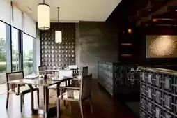 5. For dining, there is the Chinese restaurant “Shui Sha Lian,” the all-day dining restaurant “HO Jia 9,” and the lobby bar. The Chinese restaurant “Shui Sha Lian” specializes in Huaiyang cuisine and Jiang family private dishes. The restaurant’s name is derived from the ancient name of Sun Moon Lake, and the private rooms are named after places in Taiwan. The interior is decorated with designs showcasing the charm of Jinling (Nanjing). In the main hall, there is a water ripple stamp relief, which uses shallow relief to imprint early Republic of China stamps on ceramics, structured with water ripple motifs and presented as three-dimensional art. There is also an artwork titled “Tea Fragrance,” with a background of old Shanghai newspaper photos. Metal ornaments displayed in the private room corridors echo Nanjing’s past, resembling the double-eaved roofs of former palaces and temples, evoking memories of the destroyed Ming Palace and the “680 temples of the Southern Dynasties, how many pavilions and towers in the misty rain.”