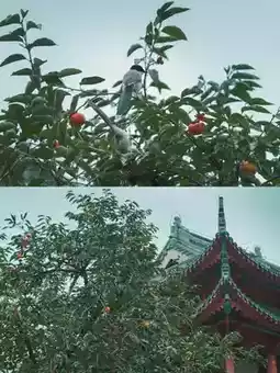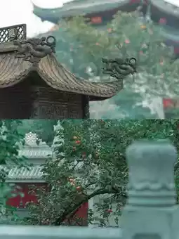 Persimmons hang like red lanterns on the eaves of Pilu Temple. Magpies jump joyfully on the branches, enjoying the delicious fruit. Smoke rises from the incense burner. Visitors look up and take photos of the persimmons. The autumn atmosphere grows stronger.