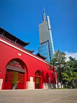 Inside the park, ancient cypress trees with twisted branches sway gracefully, sunlight filtering through the leaves onto Ming Dynasty stone inscriptions, whose mottled characters hold stories of old Jinling. On a stone bench around the corner, elders fan themselves and chat leisurely, children chase the patches of light as they run, where the atmosphere of everyday life meets ancient charm in full embrace.