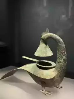 ⑥ Feather-patterned bronze phoenix lamp: This is a uniquely shaped "little clever" lamp from the Western Han Dynasty. The lamp is placed in a round hole on the back of the phoenix, and the smoke and dust slide down its neck into the water in the abdominal cavity. It is both environmentally friendly and beautiful.