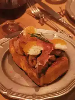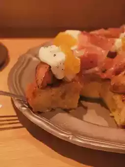The toast 🍞 is thick yet soft inside, with a crispy outer layer. The interior is soaked with egg flavor, paired with yellow peaches and bacon, offering a buttery aroma and rich texture! It would be even better if the yellow peaches were replaced with Japanese pink sweet peaches.