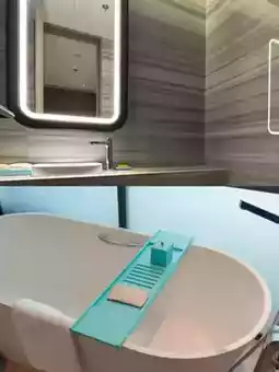 The hotel offers various room types, all spacious and bright with complete amenities. Each room is equipped with a 65-inch projection TV, sound system, and coffee machine. Every guest room has a standalone bathtub paired with high-end toiletries, ensuring a cozy and comfortable stay.