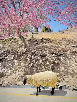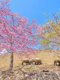 In addition to the romantic cherry blossoms, there are also super cute sheep on the green grassland. They graze and play in groups on the grassland, which is very cute. When the pink cherry blossoms and the lively sheep are in the same frame, the picture is so healing that it makes people forget all their worries in an instant and just want to enjoy this beauty.