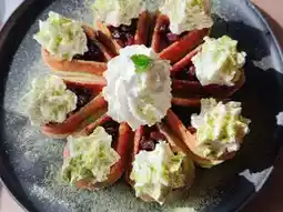 The interior is also styled with a European garden vibe, featuring plenty of wooden furniture and greenery, creating a lovely atmosphere. The menu includes pasta, risotto, pizza, pita bread, waffles, and more. Prices are on the higher side, and the taste is fairly average.