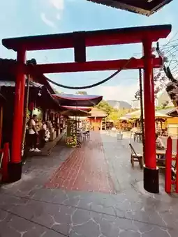 Entering the park, the torii gates, sacred lanterns, white lanterns, and wooden houses create a rich Japanese atmosphere, making you feel like you've been transported to a small town in Kyoto. 🏠