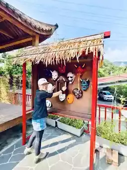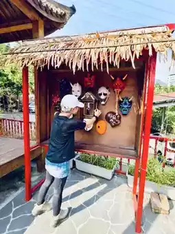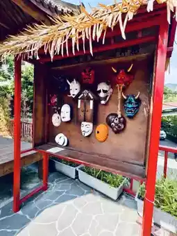 The wooden racks are covered with various ghost masks. It's said that opening the small window will reveal the "ghost's call," but don't be frightened—it's actually a mirror reflecting your own self. 😁