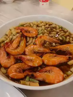 Chinese-Style Shrimp Macaroni: A unique dish. Macaroni stir-fried in Chinese-style sauce and topped with large shrimps gives it a unique, bland flavor.
