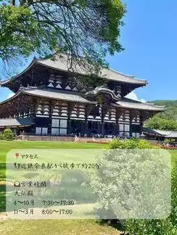 🕰️Business hours⚫︎April to October Great Buddha Hall 7:30 to 17:30Hokke-do (Sangatsu-do) and Kaidan-in Kaidan-do 8:30 to 16:00Todaiji Museum 9:30 to 17:30 (last entry 17:00)