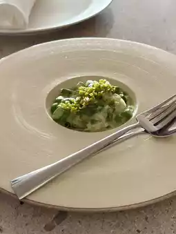 The crispness of the asparagus and the richness of the risotto are exquisitely intertwined, and the richness of the camembert and the nutty flavor of the pistachio create a deep flavor. The creaminess of the cheese accentuates the smoothness of the risotto, and the light aroma of the pistachio adds an accent to the overall impression.