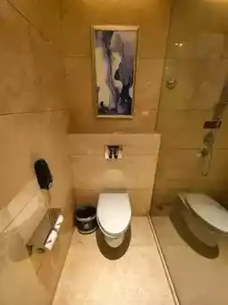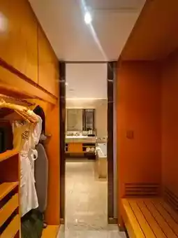 The layout is square, with a screen at the entrance to protect privacy. Due to limited space, there is no guest bathroom, but there is a separate cloakroom at the entrance that leads directly to the main bathroom. The luggage rack is spacious, and bathrobes are provided.
