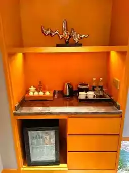 The hotel opened in 2019 and is still in good condition. The minibar is equipped with a full set of Chinese tea sets, tea bags, and six bottles of water. The mini fridge also has two free soft drinks, and the welcome fruit is plentiful, even more than some InterContinental hotels. There are also snacks on the bedside table. I can say that the benefits for high-tier members are very generous.