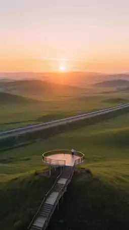 At 580km on G55 Erguang Expressway, there is a viewing platform with amazing grassland sunset views.