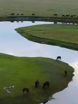 In the distance, herders and horse herds move sometimes still, sometimes in motion.