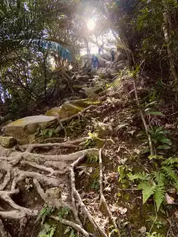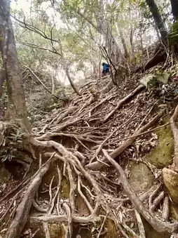 The hiking process of Wuliaojian Mountain is a dual test of physical strength and endurance. Initially, I thought the difficulty of a suburban mountain wouldn't be too high, but this trail seems to be a combination of Taguan Mountain and Guanshanling Mountain. The path winds through the tangled roots of trees, with the uneven roots naturally forming steps. Coupled with steep rock walls and rope climbing sections, although the overall elevation gain is not very high, it is full of challenges.