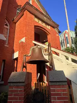 Next to the Mackay Clinic is a chapel that was originally a private house used for preaching. It was rebuilt in the 4th year of the Taisho era into a North American-style brick church. The bell tower's bell from that time still exists today. During World War II, the Japanese requisitioned it and hung it in the nearby Tamsui Red House as a street alarm. The bell was made in the USA, with the words 'York' and '30' inscribed on it. It was cracked by bombing during the war but returned to the front of the chapel a century later. The Gospel Bell has witnessed the gospel, war, and development of Tamsui since 1915.