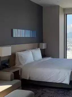 The room is modern and simple, with a large space and great lighting, especially the large floor-to-ceiling window. The sun shines in during the day and the whole room is warm. The bed is super comfortable. Lying down is like being surrounded by clouds. I don't want to get up at all! 🛏 And that desk is full of design sense and very photogenic! 📸