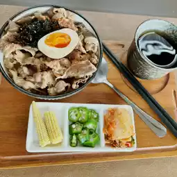 Pushing open the wooden door, the warm light and aroma of coffee greet you, instantly dispelling the chill of the rainy day. My husband skillfully ordered an iced Americano, and I chose the store's signature Ape Cafe Latte. My son excitedly pointed at the beef bowl set with his eyes shining.