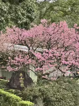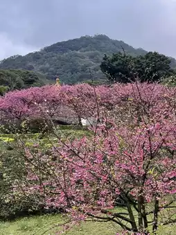 Spring is approaching, and the cherry blossoms at Tianyuan Temple in Tamsui are quietly blooming. As I walk up the mountain path, I can see the layers of cherry blossoms surrounding the majestic red dome from afar, like a fairyland. Stepping into the temple courtyard, the light pink Yoshino cherry blossoms sway gently under the blue sky. A gentle breeze blows, and the petals fall like dancing snowflakes, covering the stone steps and benches, decorating the entire Tianyuan Temple with a dreamy and serene atmosphere. Visitors come in droves, some stopping to take photos, others silently gazing, intoxicated by this springtime spectacle. I climb the steps to the observation platform, overlooking the entire cherry blossom forest, with the distant Tamsui River and green mountains complementing each other, creating a picturesque scene. The afternoon sun is warm, casting dappled light through the branches, adding a touch of tenderness to the cherry blossoms. Devotees quietly pray inside the hall, the sound of the bell reverberating, intertwining with the swaying cherry blossoms to create a peaceful and harmonious picture. As the sun sets, the twilight dyes the sea of flowers with a layer of golden powder. Reluctantly, I leave, looking back at Tianyuan Temple, the red pavilion embraced by cherry blossoms, still serene and splendid, like a beautiful dream in the spring.