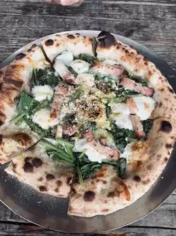 The temperature is low today and it is drizzling, but we still choose to sit outside the store. We are surrounded by the smell of moist soil and the tranquility of the mountains and forests. It seems as if we are isolated from the world, with only us and the food in front of us. The pizza baked to order has a strong charcoal aroma and the crust is chewy. Today we ordered a spinach bacon pizza, which was delicious😋. I also ordered the Fireworks Italian Handmade Pasta, the noodles were chewy and slightly spicy overall. Needless to say, the French fries are sold out as soon as they are served. Feeling the beauty of food is the purest moment of happiness.