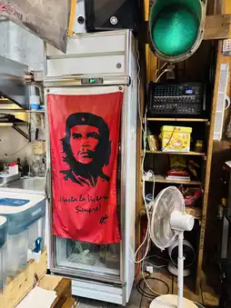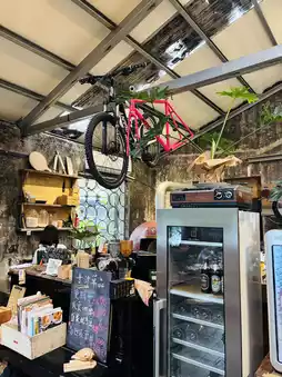 The store's decoration style is a mix of industrial retro and country style, full of personality and warmth. The bare concrete walls, iron frame ceiling and open counter create a casual yet detailed atmosphere. The most eye-catching thing is the pink bicycle hanging on the beam, which adds vitality and fun to the space. The kiln oven is hidden behind the counter, revealing that this is not just a cafe, but also a place to enjoy delicious food. The bar counter is furnished with a blackboard handwritten menu, coffee utensils and books, giving people a strong sense of handcraft and humanistic atmosphere. The personalized collection elements make people feel that they are not just coming to eat and drink coffee, but more like exploring a space full of stories.