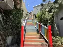 Next to it is the rainbow stairs, which lead to the Jinguashi Museum, and to the left are the Baoshi Mountain and Teapot Mountain trails.