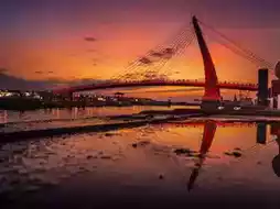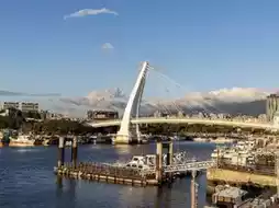 The Lover's Bridge at Tamsui Fisherman's Wharf is a white cable-stayed pedestrian bridge spanning the harbor. Measuring approximately 196 meters in length, it takes about 3 minutes to walk across. From the bridge, visitors can enjoy the famous Tamsui sunset views. The Lover's Bridge is a popular dating spot for couples, with its white sailboat design complementing the docked boats nearby, creating a strong maritime ambiance. Visiting the bridge at dusk offers a stunning view of the sunset, as the afterglow bathes the bridge in a soft orange-red hue, making it incredibly picturesque. As night falls, the bridge transforms with vibrant rainbow-colored light displays, illuminating the Tamsui Riverbank.