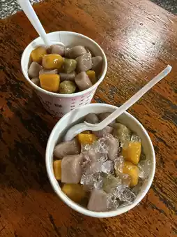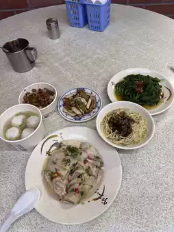 Among the many delicacies, Auntie A-Gan's taro balls are a must-try. The large bowl of taro and sweet potato balls is translucent and chewy, with a soft yet springy texture. The taro's fragrance and the sweet potato's natural sweetness spread in your mouth, perfectly complemented by the chilled soup base, making it both refreshing and satisfying. On the other side, Zhang Ji's braised pork rice offers a taste of local comfort food: tender chicken with silky skin, simple yet flavorful dry noodles, rich and savory Fuzhou fish ball soup, and blanched sweet potato leaves that cleanse the palate. A table of small dishes and bowls can surprisingly whet your appetite.