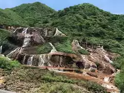 The Golden Waterfall, located in the former gold and copper mining region of Jinguashi near Jiufen, is one of Taiwan's most unique and photogenic natural sights. It earns its name from the striking, brilliant golden-brown and rusty-yellow hue of the multi-tiered cascade. This unique color is not pollution, but a natural phenomenon resulting from the high concentration of heavy metal minerals—mostly sulfur, arsenic, and copper ore—that seep from the abandoned mine tunnels into the water. As the minerals oxidize upon contact with the air, they dye the rocks a spectacular metallic gold.