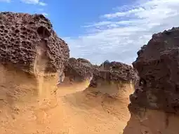 Taiwan is not just about temples; it also boasts unique and stunning natural attractions. Today, let me take you out of Taipei City to the New Taipei area. You can take bus number 1815 or 1815A from Taipei City Hall Station, which takes about an hour and a half to reach the Yeliu bus stop. Don't worry about getting lost, as there are plenty of tourists, and tour buses also stop here. From the bus stop, it's just a short walk to the park. The entrance fee is around 120 NTD, and you can book in advance on Trip.com. The park is open from 8:00 AM to 5:00 PM. Yehliu Geopark is a place where the land, formed by rocky mountains, extends into the sea. Over time, erosion by seawater and wind has created uniquely shaped rock formations. The area also has a distinctive ecosystem, which is why it has been preserved as a geopark. We recommend visiting either early in the morning or late in the afternoon before the park closes to capture the best lighting for photos.