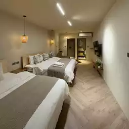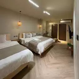 The decor is simple and rustic, dominated by wood tones. Check-in is self-service; you simply pick up your room key from the key box in the lobby and go upstairs. Check-out is also done by hand. The double bed is oversized, with just the right firmness for a comfortable sleep. The separate toilet and shower ensure friends can enjoy the stay without having to worry about waiting for each other.
