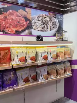 The shop has a cozy, traditional vibe with red lanterns and wooden shelves stacked with local products. You can find various types of dried seafood, spicy sauces, and snacks neatly packaged for travelers. 🌶️🐟
