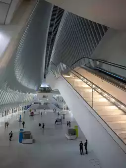 "The Oculus" at the World Trade Center is a futuristic building designed by Spanish architect Santiago Calatrava. It features a design resembling spreading white wings, and the interior is an open space where light pours in. It is a key transportation hub where the subway and PATH trains run, but it is also popular as a shopping mall with luxury brand shops and restaurants.
