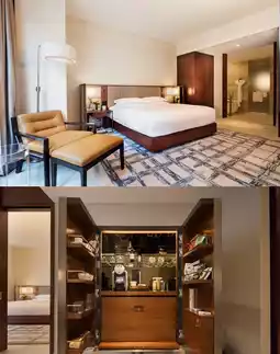 ✨The hotel's architecture is modern and elegant, with a low-key and luxurious entrance, but when you enter the lobby, you can see the dazzling brilliance of the giant crystal chandelier. Oil paintings by the French painter Fragonard hang high on the ceiling, exuding a charming artistic atmosphere 🎨 The interior rooms blend classical and modern elements, are spacious and comfortable, and some suites have kitchenettes 🍳