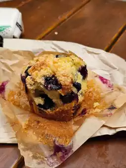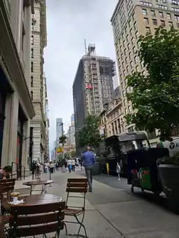We ordered a vanilla latte, a cold brew, and a blueberry muffin. Our total bill was $22. There's no seating inside, only outdoor terrace seating. Sitting on the terrace affords a view of Fifth Avenue and the skyscrapers, truly immersing us in New York City. It's fun to sit and admire the bustling crowds and the tall buildings.