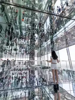 Located atop One Vanderbilt, this immersive 360-degree observation deck features a fully mirrored glass space with suspended transparent capsules, LED light waterfalls, and an array of inflatable silver spheres. A fully transparent glass elevator on the 94th floor is even more thrilling.