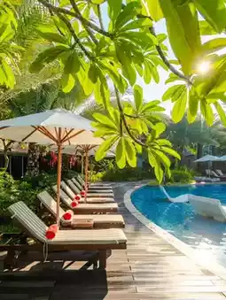 swimming and lying down on a private beach hammock under the shade of palm trees