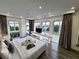 There is also a living room. The spacious floor and the view are great. And you can use all 3 swimming pools.