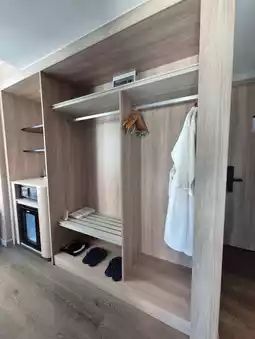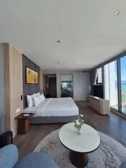 The room, true to its 'boutique' name, was small but stylishly designed. With wooden furniture and a white base, it felt clean and luxurious. The bed was surprisingly soft, which helped relieve the fatigue from walking around all day. The partial sea view from the window was a nice touch, and the warm lighting created a cozy atmosphere.