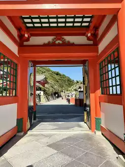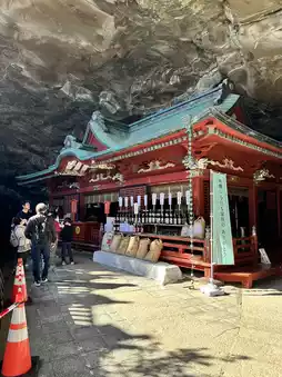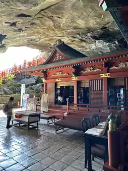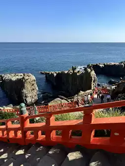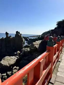 The vibrant vermilion-lacquered main shrine is located inside a cave. The cape is surrounded by strange rock formations and reefs, offering views of the raging Pacific Ocean.