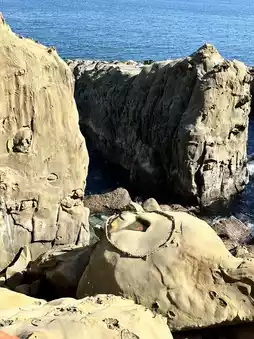 Looking down at the coast from the plaza in front of the main shrine, you'll see the Turtle Rock.