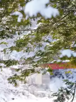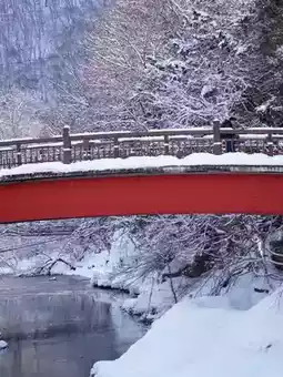 [Tochigi x Yunishigawa] Old houses and the red bridge where you can see the main house Hankyu. The snow scenery is wonderful.