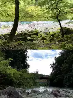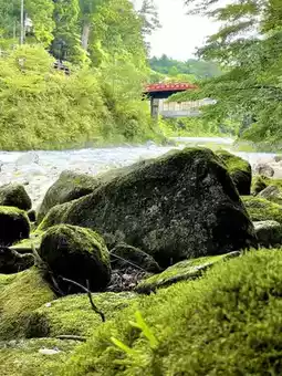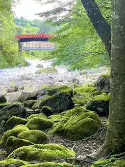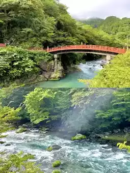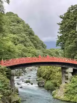 The river's crystal clear waters, reflecting the greenery of the mountains, create a stunning contrast with the bridge's vermilion, making it a popular photo spot.