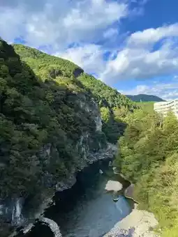 From the suspension bridge, you can enjoy a panoramic view of the clear waters of the Kinugawa River and the hot spring town.