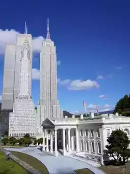 The park is divided into the Asia Zone, featuring landmarks like the North; the Japan Zone, featuring historical buildings like Kinkaku-ji Temple; the Modern Japan Zone, home to Tokyo Skytree Town; the America Zone, featuring the Empire State Building; the Egyptian Zone, featuring the pyramids and the Sphinx; and the European Zone, featuring the Sagrada Familia and London Bridge.