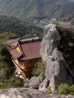 After reaching the top, you can see a huge rock that looks like a woman standing and gazing into the distance. It is called Lady Yueling. Below the stone is the Madam Temple. Standing on the stone, you can overlook the Fenghua city area.