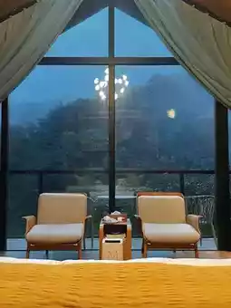 Their room types are super rich, including fairy-tale colorful wooden houses, pentagonal starry sky wooden houses, triangular starry sky wooden houses, and Tangchi loft suites. I stayed in the Tangchi loft suite, which has two floors and a spacious space. The wooden house has its own balcony, where you can overlook the mountain view and watch the stars at night ✨. In winter, you can soak in the hot spring in the room. The mountains are surrounded by clouds and mist, as if you are in a fairyland.