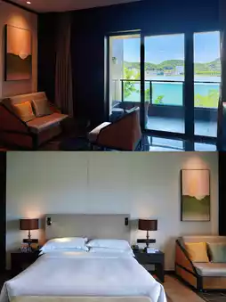 Spacious rooms feature balcony loungers for enjoying the misty Dongqian Lake. The oversized bathtub🛁 rivals a private hot spring♨️—sip champagne and watch the sunset for pure romance! Smart home amenities and luxury toiletries add to the indulgence.