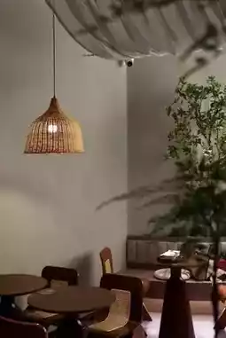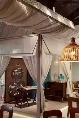 Flowing drapes, bamboo shadows like ink paintings, and soft light from woven bamboo lanterns